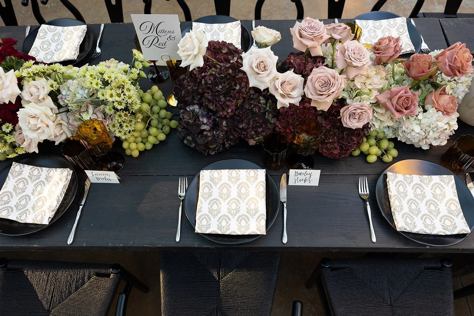 We anchored the room with a head table that made a statement without asking for permission. Dark wood, black chairs, black flatware, black plates—fully saturated, bold, and grounded. Then we softened it just enough with a light patterned napkin that tied seamlessly into the maroon, greens, and white florals running the length of the table. It was moody, elevated, and completely commanding.